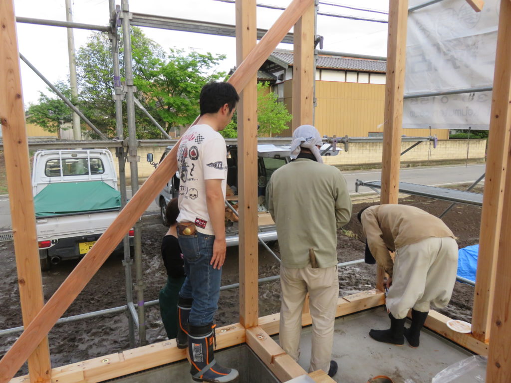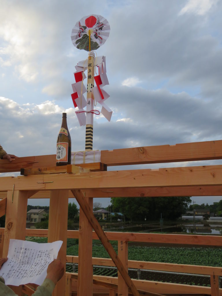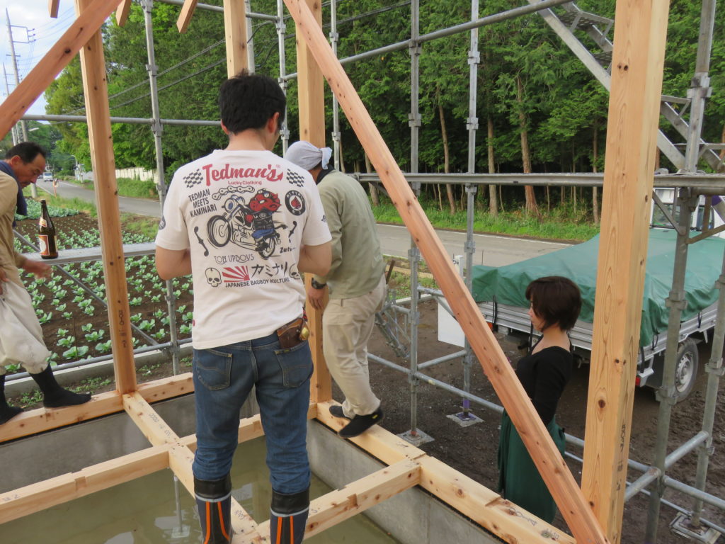 その後、お施主様とお酒でのお清めをする職人さん。